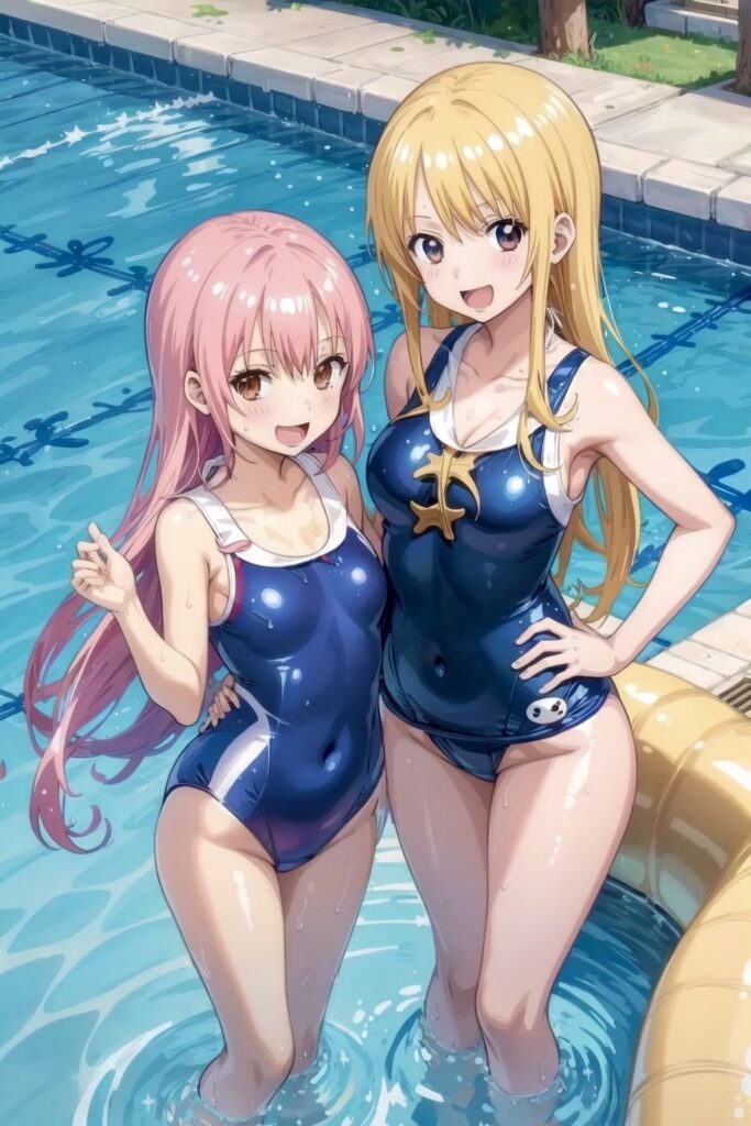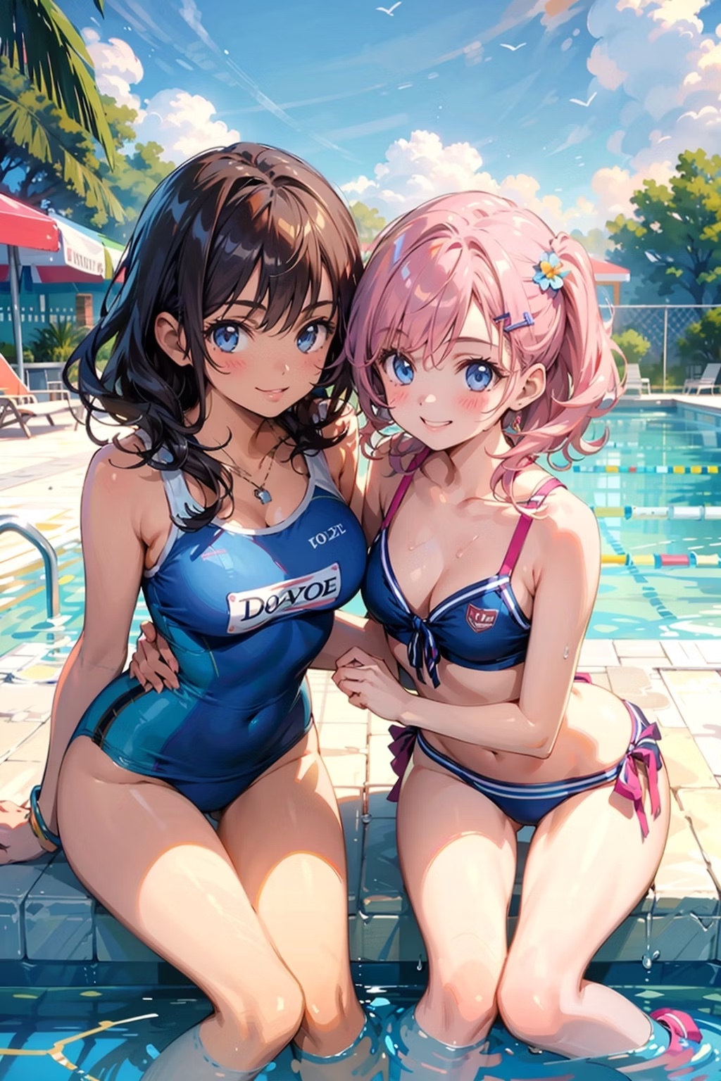 (best quality:1.2), 2girls, school swimwear, glossy, dynamic pose, outdoor, poolside