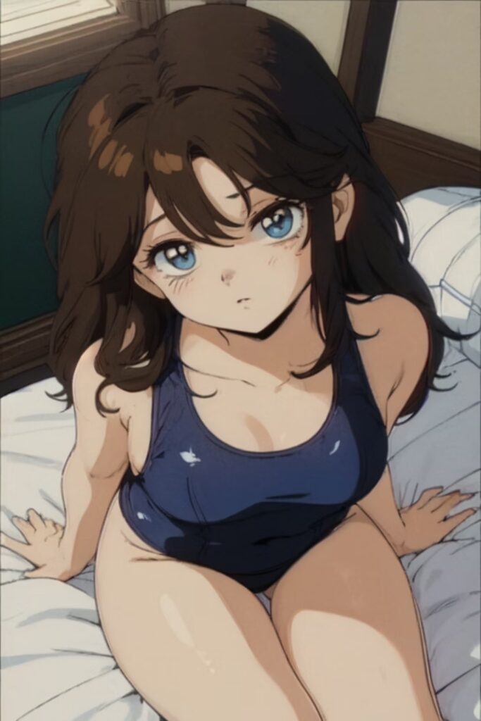 letoro illustration, sitting on bed, wareza, school swimsuit,oil wet, brown long hair, shiny hair,blue eyes, embarrassed, shiny skin,in heat, looking up, dynamic lighting, 1990s (style), 1980s (style), retro style, Ami, brown hair, long hair